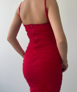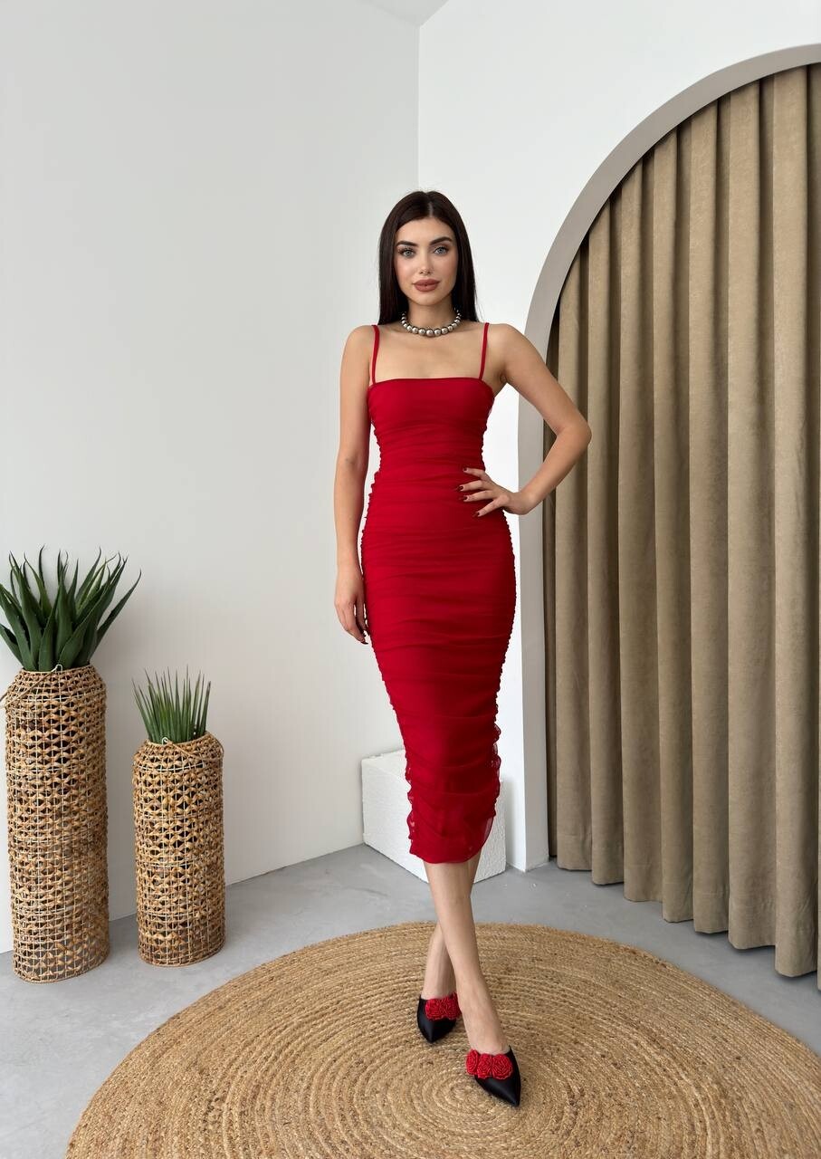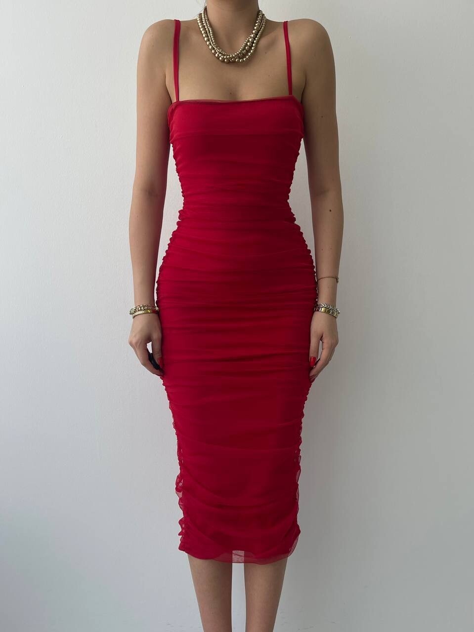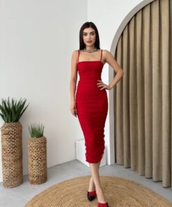 يتميز بحمالات رفيعة وتصميم ضيق يبرز جمال القوام. الفستان يأتي بطول متوسط يصل إلى منتصف الساق، ويحتوي على تفاصيل مجعدة تعزز من جمال التصميم وتضفي لمسة عصرية.