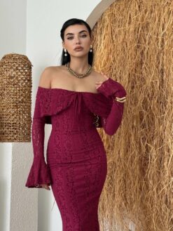 مصنوع من قماش دانتيل فاخر يمنح الإطلالة ملمساً ناعماً وتفاصيل فريدة تبرز الذوق الرفيع. تصميمه سترابلس (بدون أكتاف) يعكس جاذبية راقية، مع ربطة أمامية تضيف لمسة أنثوية ناعمة.