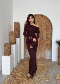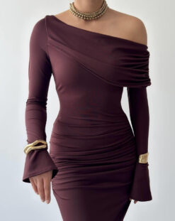 الفستان يظهر بنيأحمر أنيق مع قصة طويلة ضيقة (Bodycon) تبرز قوام الجسم، وقماش مطاطي مشدود مع كشكش جانبي. يتميز بكتف ساقط (One-Shoulder/Off-Shoulder) أقرب للـ Straplez مما يعطيه لمسة عصرية أنثوية.