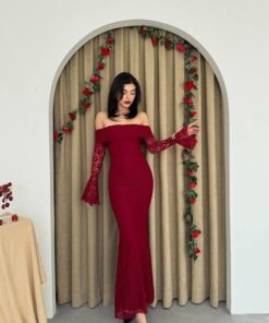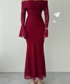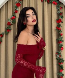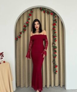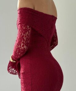 فستان خمري بكتف مكشوف وتصميم ضيّق يُبرز القوام، مصنوع من دانتيل فاخر بأكمام طويلة متّسعة تضيف لمسة درامية أنثوية. مثالي للسهرات والمناسبات الخاصة بإطلالة جريئة وأنيقة.