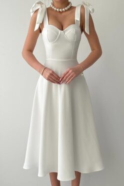 فستان أبيض ناعم بربطات فيونكة وقصة انسيابية