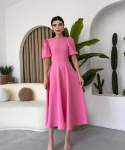 هذا الفستان الميدي باللون الوردي الساحر يجمع بين البساطة والرقي، بتصميم انسيابي يناسب مختلف المناسبات. يتميز بأكمام منفوشة قصيرة تضيف لمسة عصرية، مع قصة محددة عند الخصر لإبراز جمال القوام. القماش الناعم والخفيف يضفي راحة وأناقة طوال اليوم، بينما الطول المتوسط يمنحك إطلالة محتشمة وأنيقة في آنٍ واحد. مثالي لحفلات النهار، المناسبات الرسمية، أو حتى الطلات اليومية الراقية.