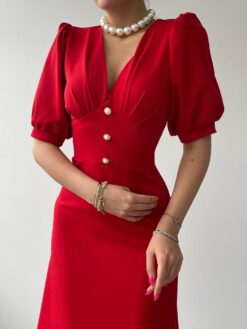 فستان أحمر أنيق بطول متوسط وتصميم كلاسيكي. يتميز بأكمام منتفخة قصيرة وأزرار أمامية تضفي لمسة أنيقة. الفستان بقصة مريحة وينساب بنعومة على الجسم، مما يجعله مثاليًا لمختلف المناسبات.