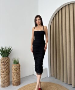 يتميز بحمالات رفيعة وتصميم ضيق يبرز جمال القوام. الفستان يأتي بطول متوسط يصل إلى منتصف الساق، ويحتوي على تفاصيل مجعدة تعزز من جمال التصميم وتضفي لمسة عصرية.