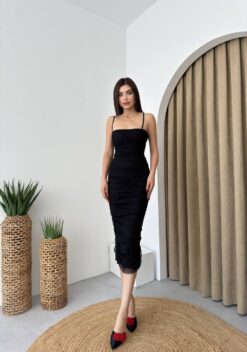 يتميز بحمالات رفيعة وتصميم ضيق يبرز جمال القوام. الفستان يأتي بطول متوسط يصل إلى منتصف الساق، ويحتوي على تفاصيل مجعدة تعزز من جمال التصميم وتضفي لمسة عصرية.