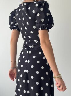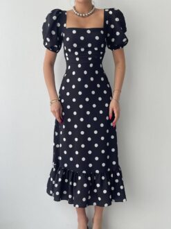 فستان أنيق من القماش الأسود المزين بنقاط بولكا بيضاء، يتميز بأكمام منفوخة وتصميم جذاب. مناسب للمناسبات الصيفية والحفلات.
