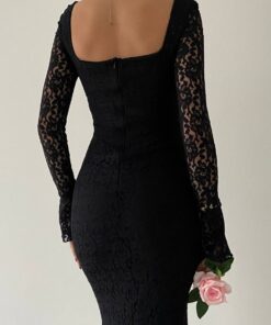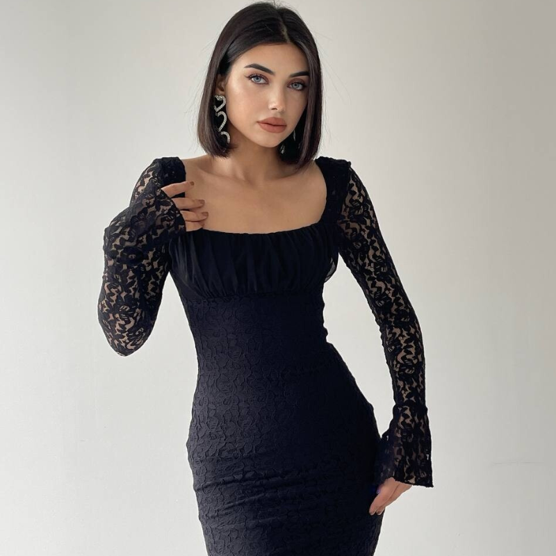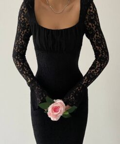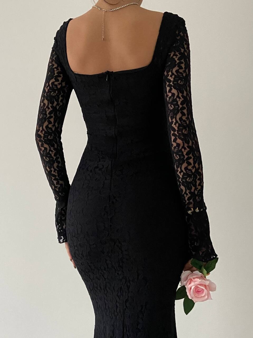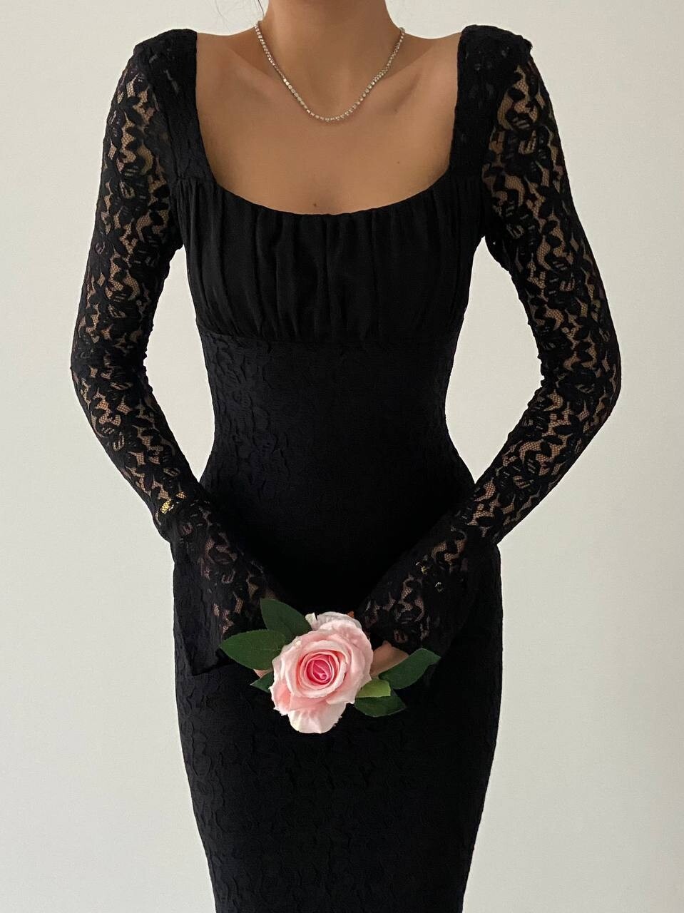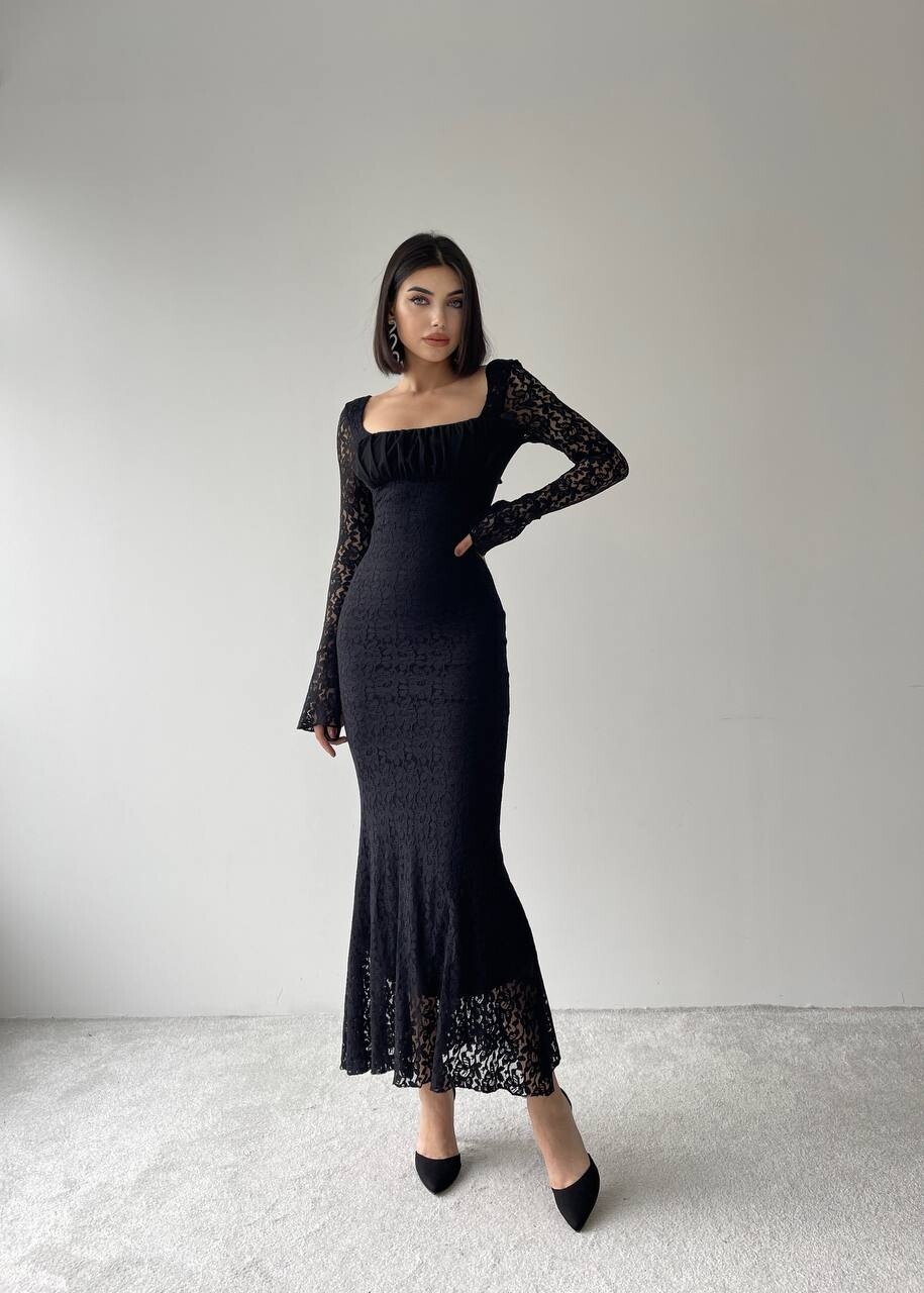 فستان أسود مصنوع من الدانتيل بتصميم يجمع بين الكلاسيكية والحداثة