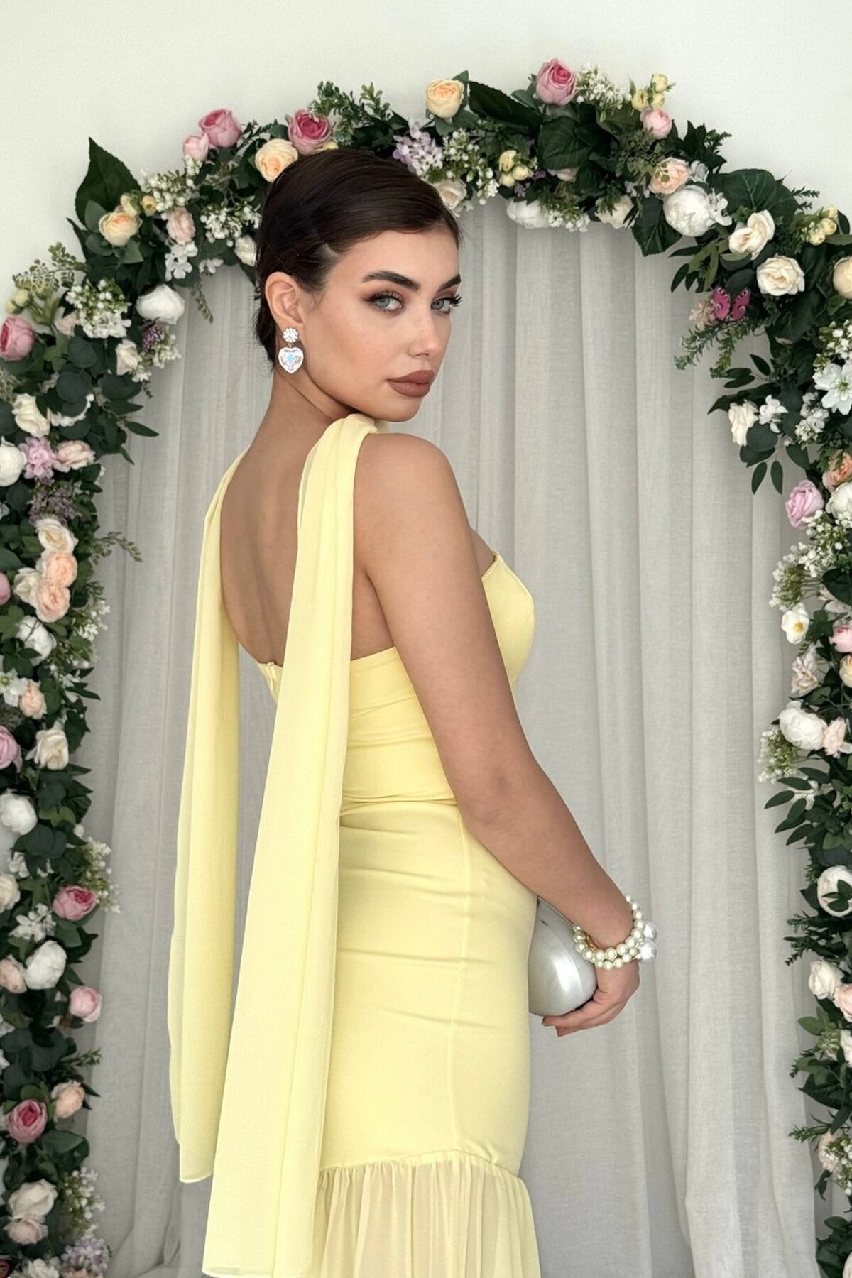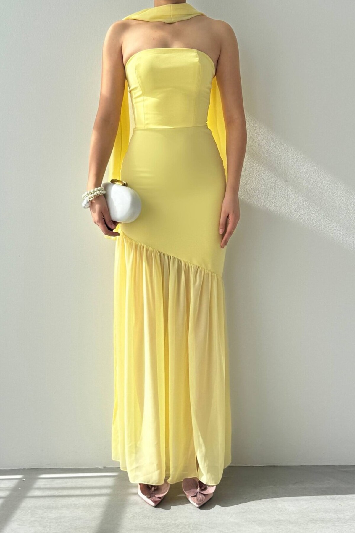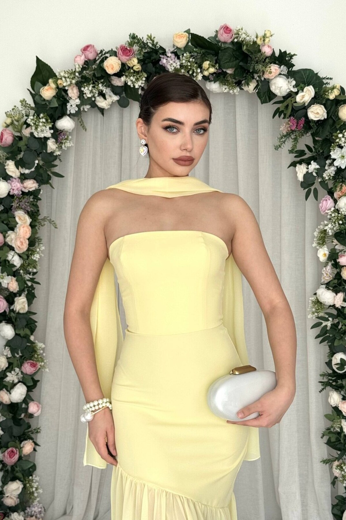 فستان أنثوي بيبي يلو بتفصيلة شال ناعمة