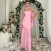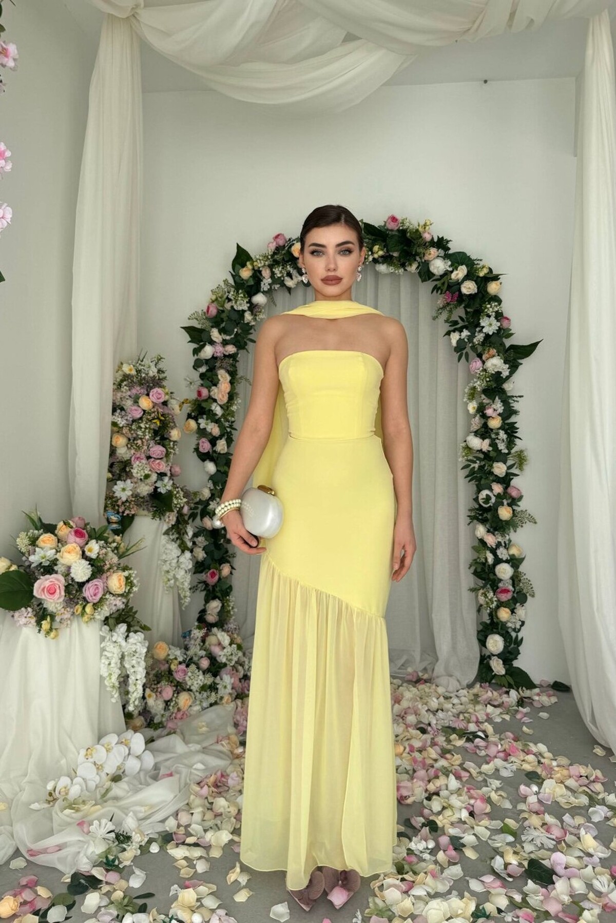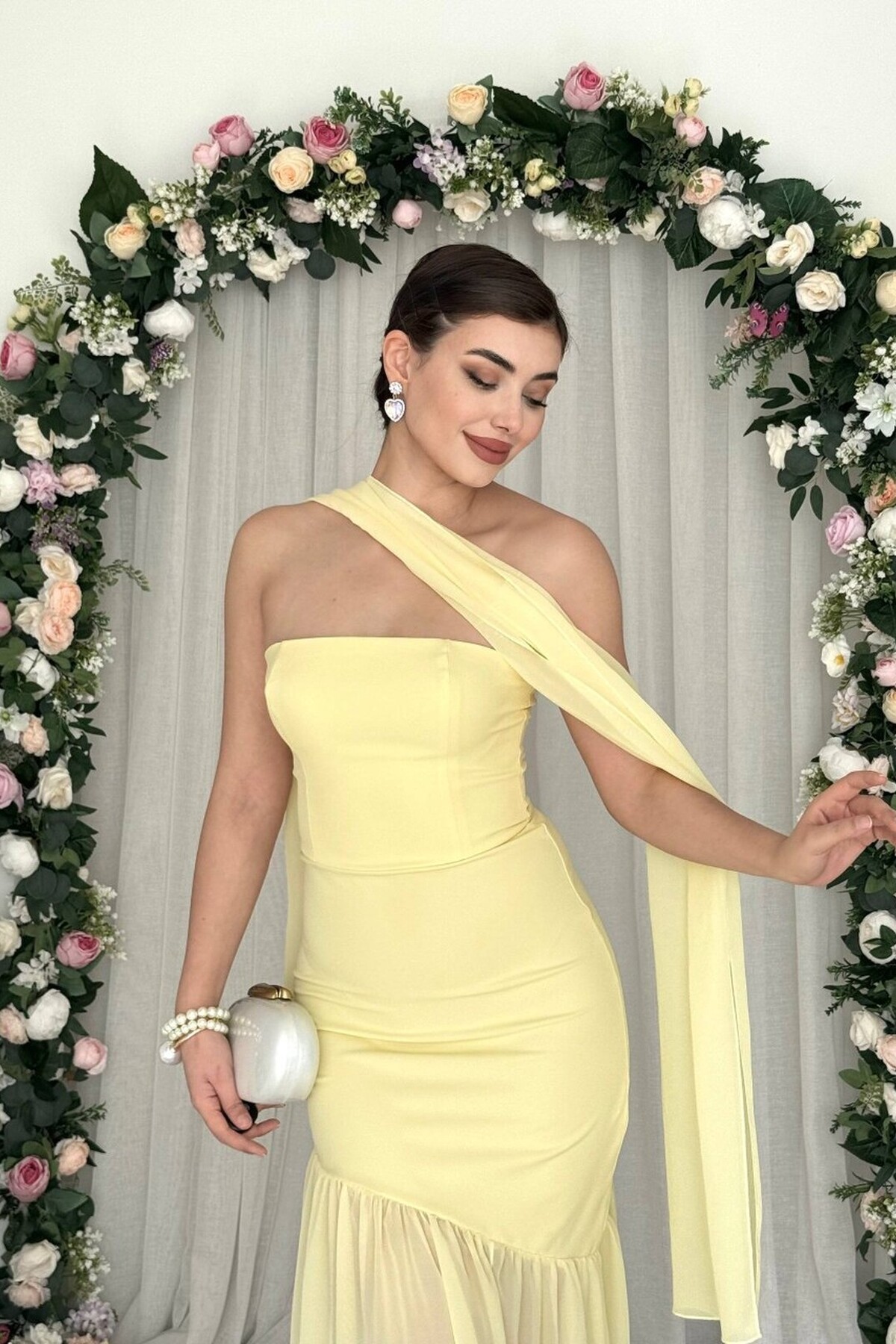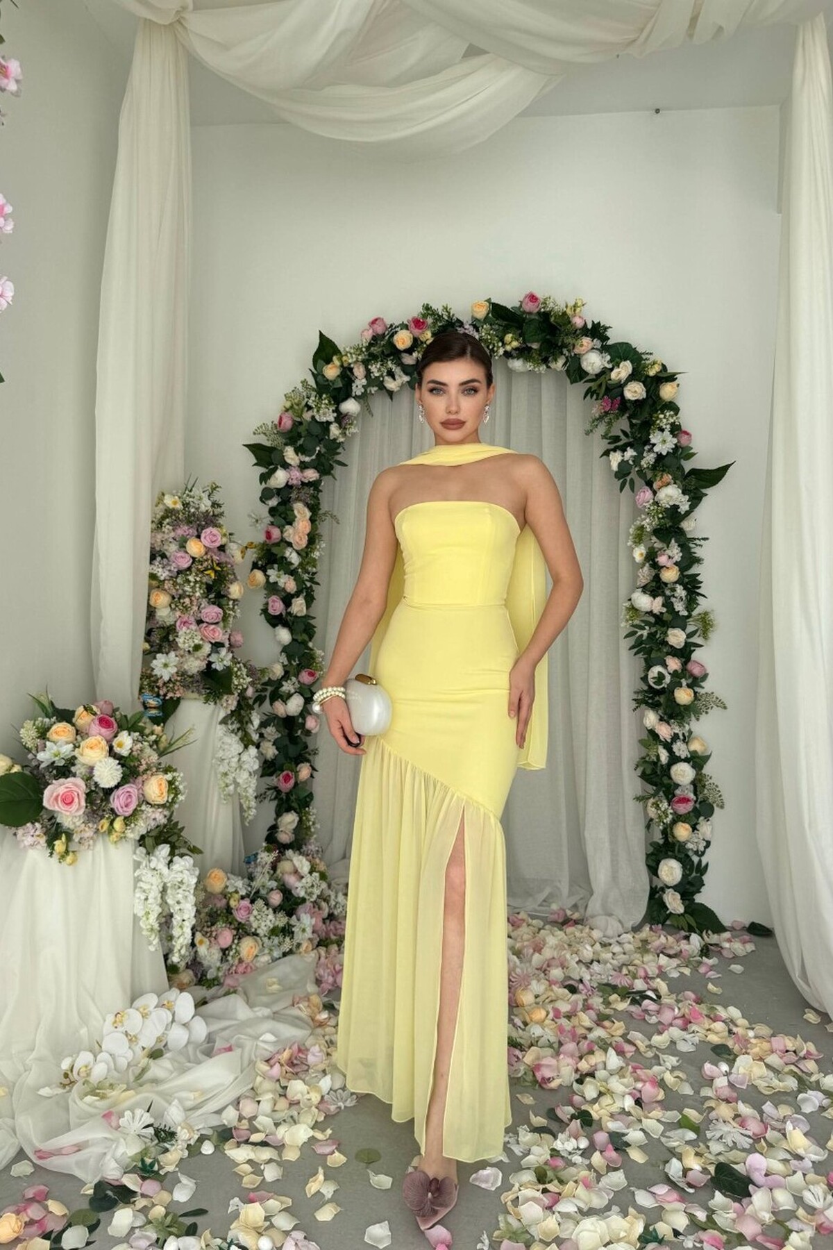 فستان أنثوي بيبي يلو بتفصيلة شال ناعمة