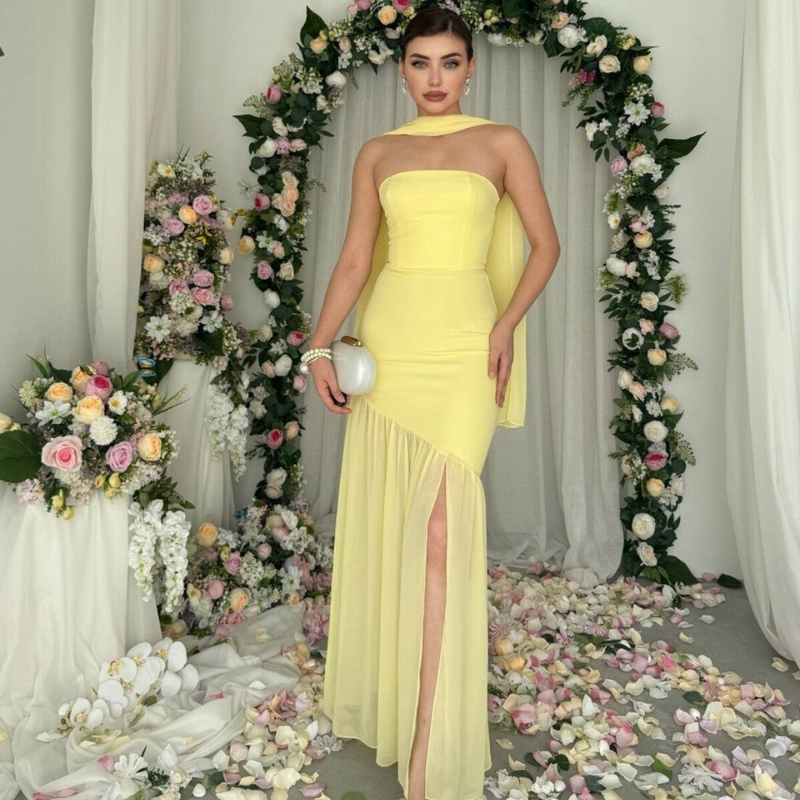 فستان بيبي يلو أنثوي بتفصيلة شال ناعمة، تصميمه البسيط مع القصة الانسيابية بيعطيك إطلالة راقية وهادئة بنفس الوقت