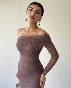 فستان بني أنيق بكتف واحد وكم شفاف مجعد، يتميز بقصة ضيقة تبرز جمال القوام ويصل إلى منتصف الساق.