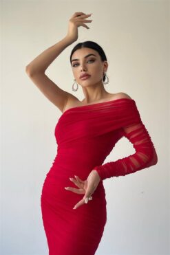 فستان أحمر أنيق بكتف واحد وكم شفاف مجعد، يتميز بقصة ضيقة تبرز جمال القوام ويصل إلى منتصف الساق.