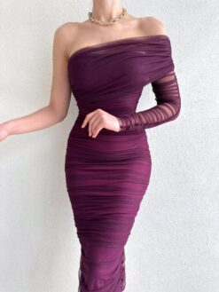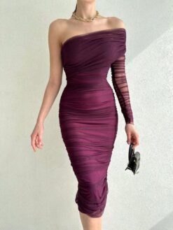فستان أحمر أنيق بكتف واحد وكم شفاف مجعد، يتميز بقصة ضيقة تبرز جمال القوام ويصل إلى منتصف الساق.