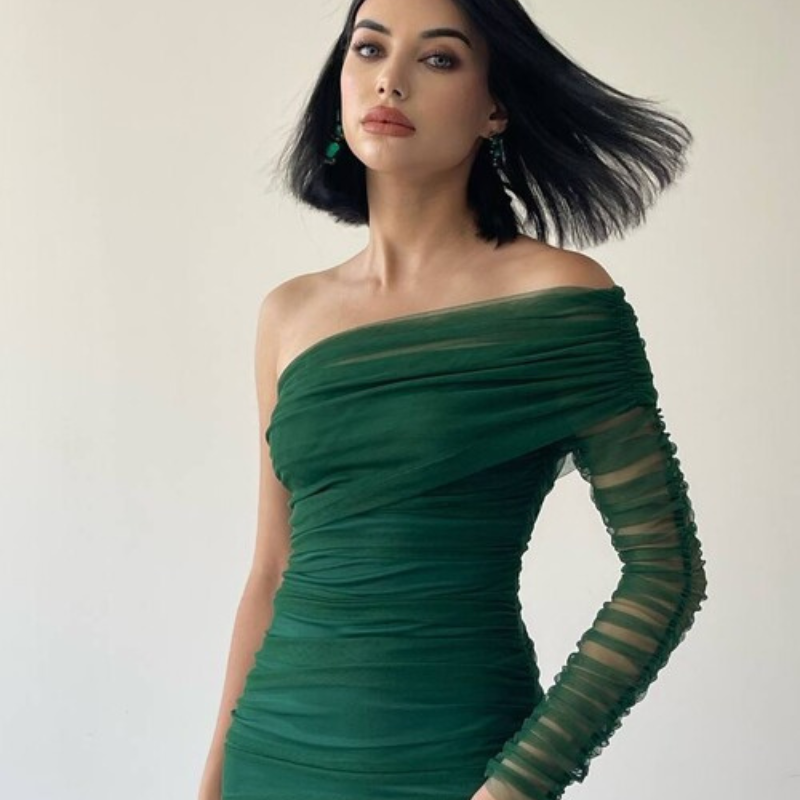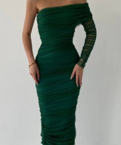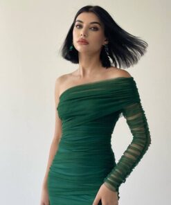 فستان أخضر أنيق بكتف واحد وكم شفاف مجعد، يتميز بقصة ضيقة تبرز جمال القوام ويصل إلى منتصف الساق.
