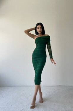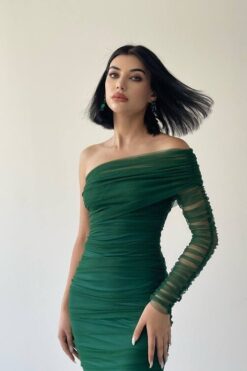 فستان أخضر أنيق بكتف واحد وكم شفاف مجعد، يتميز بقصة ضيقة تبرز جمال القوام ويصل إلى منتصف الساق.