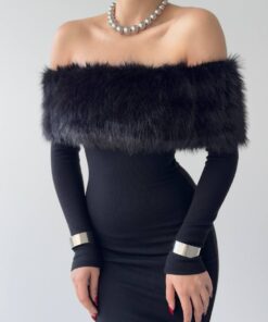 هذا المنتج عبارة عن فستان أنيق يتميز بتصميم بدون أكتاف (ستربليس) مع تفاصيل من الفرو الفاخر على الجزء العلوي، مما يضيف لمسة من الفخامة. يتميز بلونه الأسود الكلاسيكي، مما يجعله مناسبًا للمناسبات الخاصة والسهرات.