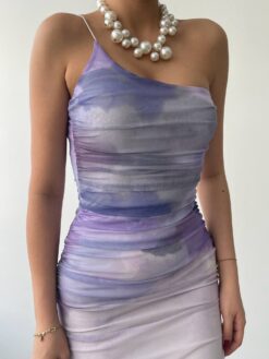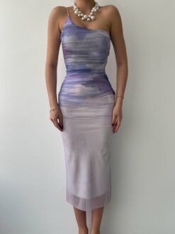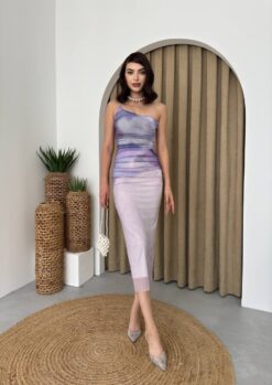 يتميز بنقشة سحابية تجعله ملفتًا للنظر. الفستان مصمم ليبرز جمال القوام بتفاصيله المجعدة التي تضيف لمسة عصرية. القماش ناعم ومريح، مما يجعله مثاليًا للسهرات والمناسبات الخاصة.