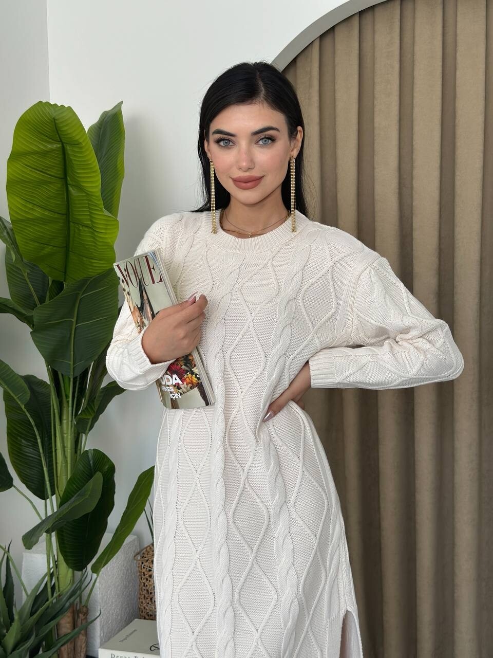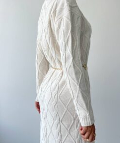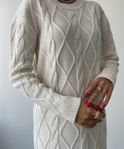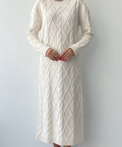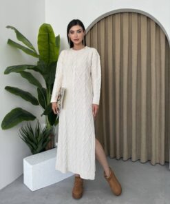 هذا المنتج عبارة عن فستان تريكو أنيق يتميز بتصميمه الطويل وأكمامه الطويلة، مع تفاصيل نسيجية على شكل خطوط متعرجة تضفي لمسة عصرية وجذابة. الفستان بلون كريمي دافئ، مما يجعله خيارًا مثاليًا للإطلالات الشتوية اليومية أو المناسبات غير الرسمية. يتميز بالراحة والدفء مع تصميم مناسب لجميع الأوقات.