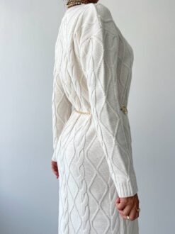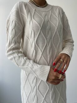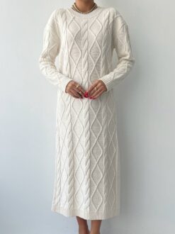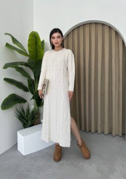 هذا المنتج عبارة عن فستان تريكو أنيق يتميز بتصميمه الطويل وأكمامه الطويلة، مع تفاصيل نسيجية على شكل خطوط متعرجة تضفي لمسة عصرية وجذابة. الفستان بلون كريمي دافئ، مما يجعله خيارًا مثاليًا للإطلالات الشتوية اليومية أو المناسبات غير الرسمية. يتميز بالراحة والدفء مع تصميم مناسب لجميع الأوقات.