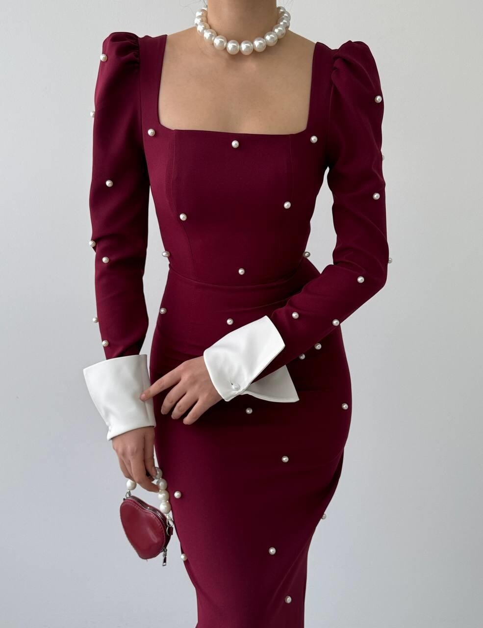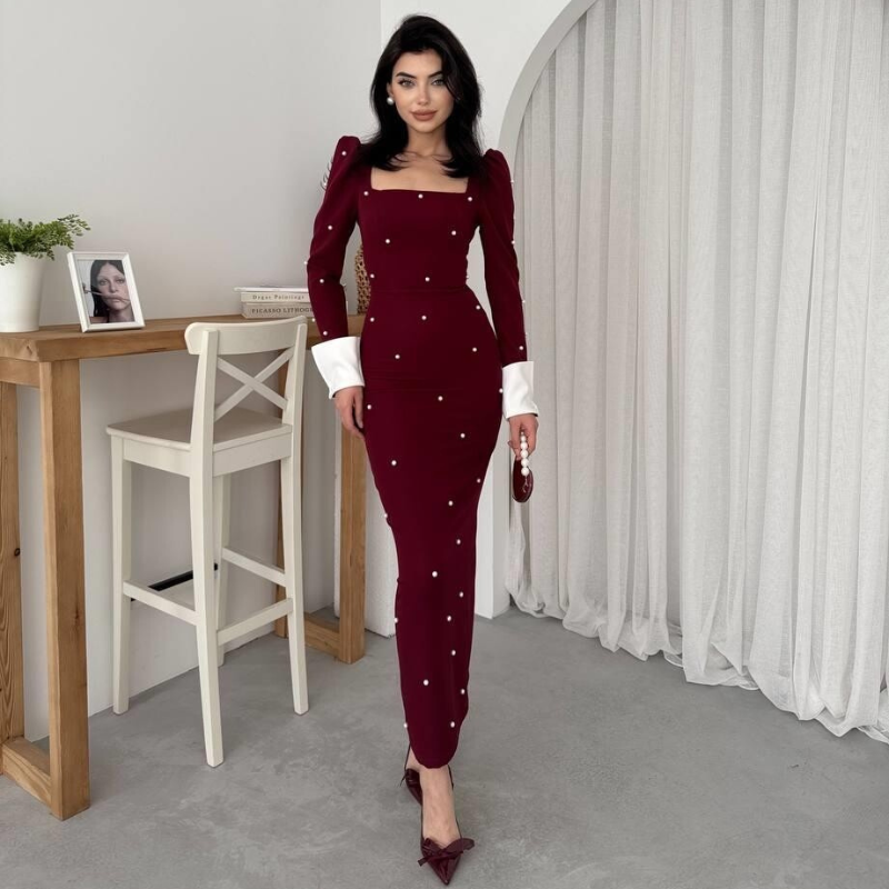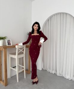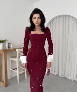 فستان أنيق ذو تصميم عصري، يأتي بلون خمري غني، ويتميز بتفاصيل لؤلؤية متوزعة على كامل الفستان، مما يضيف لمسة من الفخامة والأنوثة. يحتوي الفستان على أكمام طويلة ومنتفخة عند الكتف، مع أطراف مغطاة بتفاصيل بيضاء تبرز جمال الأكمام. كما يتميز بقصة ضيقة توضح القوام، ويصل طوله إلى أسفل الركبة تقريبًا، مما يجعله خيارًا مثاليًا للمناسبات الرسمية أو السهرات الراقية. تكتمل الإطلالة بحذاء ذو كعب عالي مزخرف بتفاصيل في شكل أربطة، مما يعزز الجمال العام للفستان.