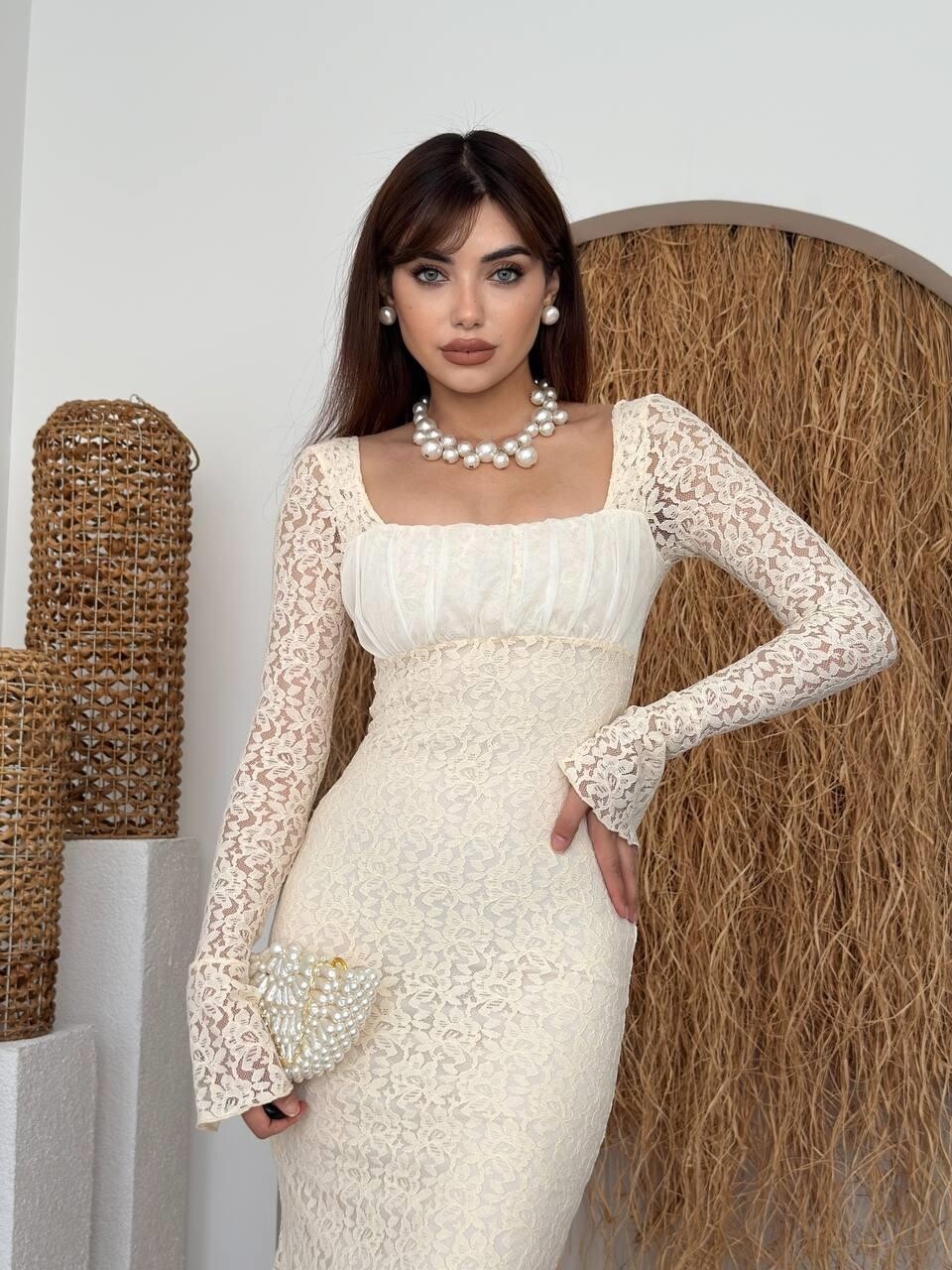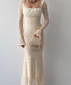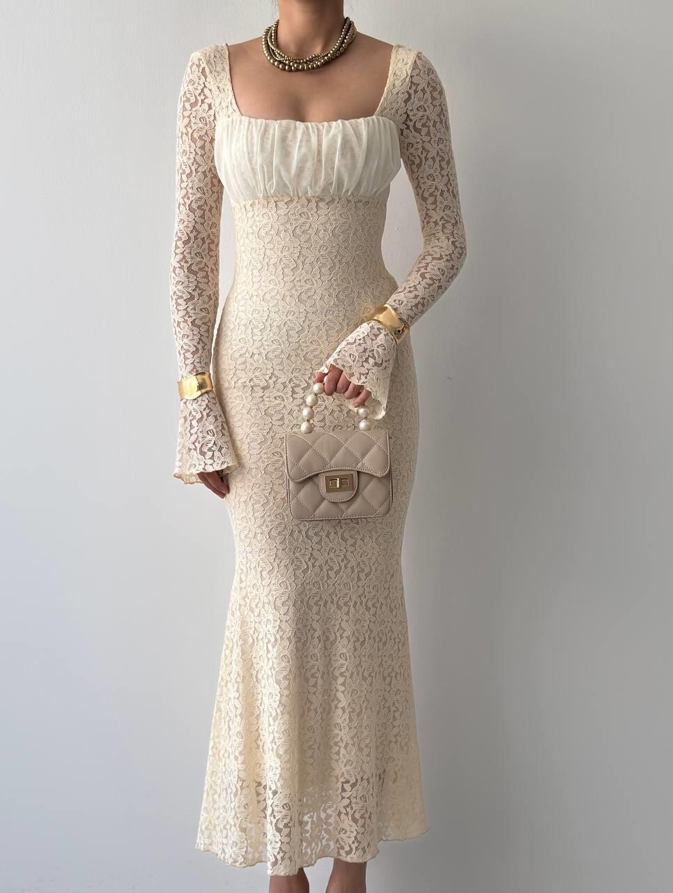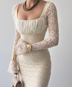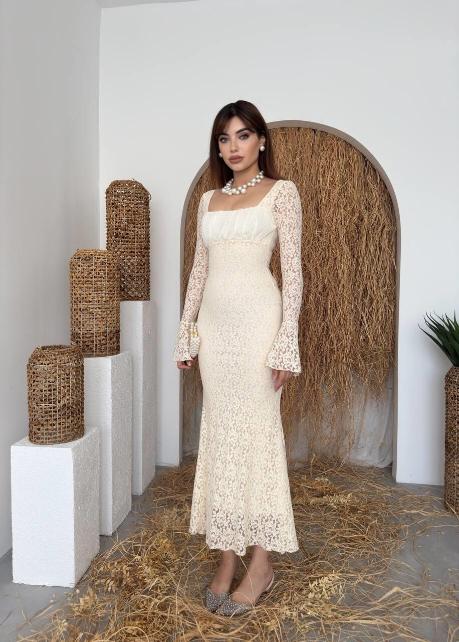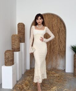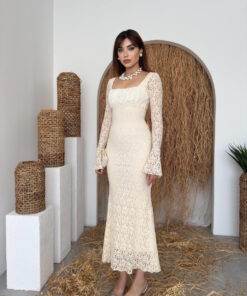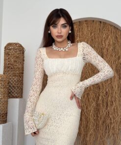 - الأكمام: طويلة وشفافة من الدانتيل