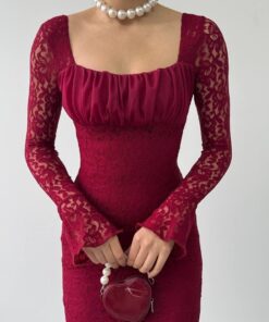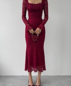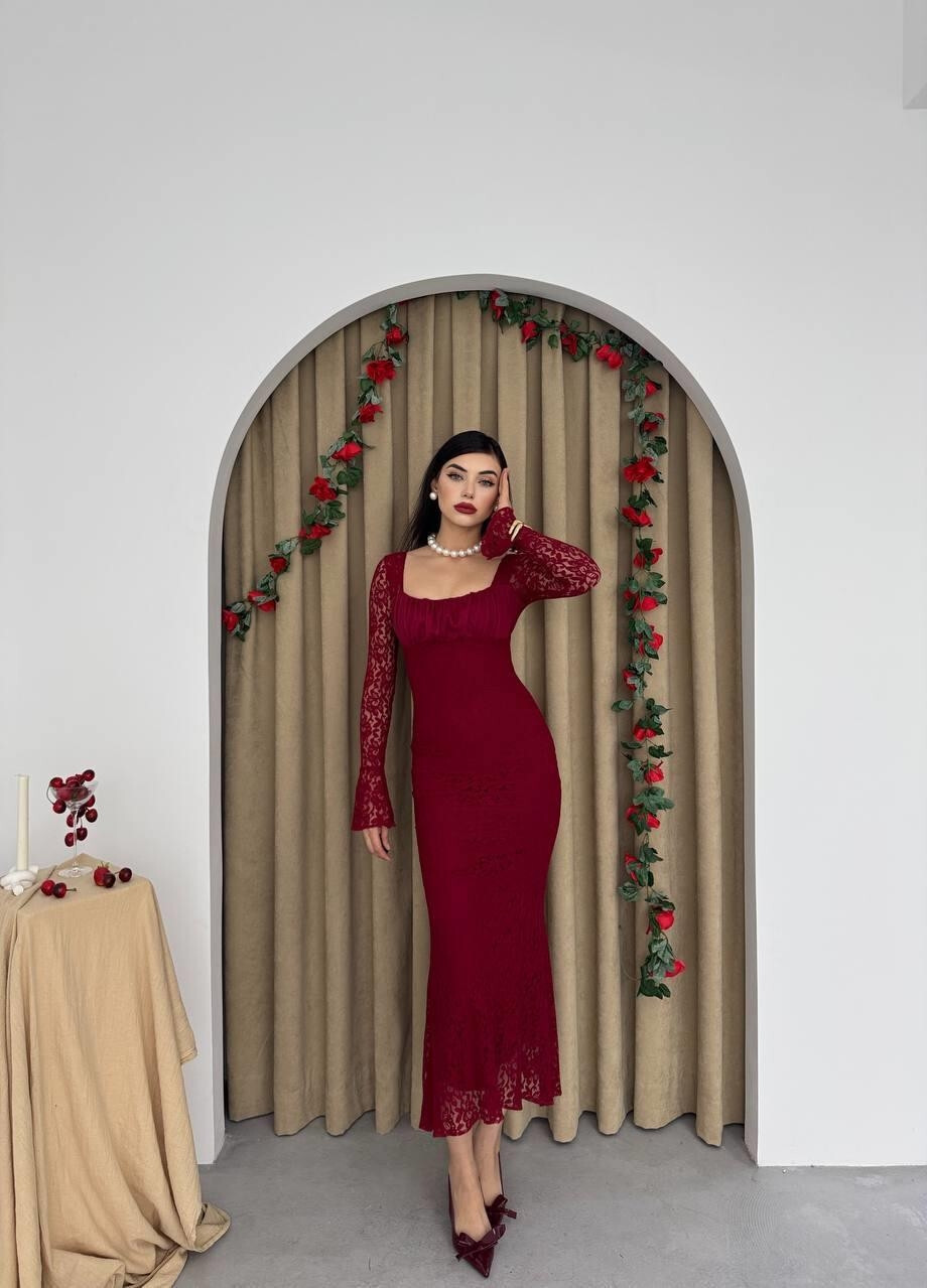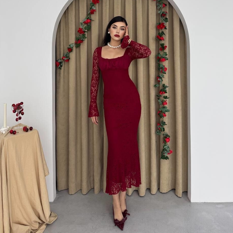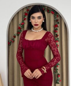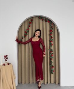 الفستان يأتي بتصميم ضيق يلتف حول الجسم ليبرز جمال الخصر وينساب بسلاسة إلى الأسفل. النسيج المزخرف بنمط الزهور يعطي الفستان مظهراً فاخراً ومميزاً، مما يجعله خياراً مثالياً للسهرات والمناسبات الخاصة.