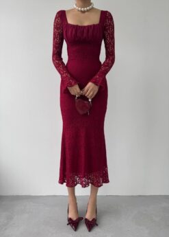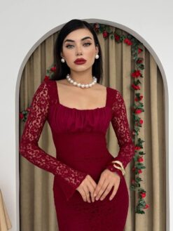 الفستان يأتي بتصميم ضيق يلتف حول الجسم ليبرز جمال الخصر وينساب بسلاسة إلى الأسفل. النسيج المزخرف بنمط الزهور يعطي الفستان مظهراً فاخراً ومميزاً، مما يجعله خياراً مثالياً للسهرات والمناسبات الخاصة.