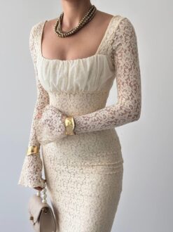 - الأكمام: طويلة وشفافة من الدانتيل