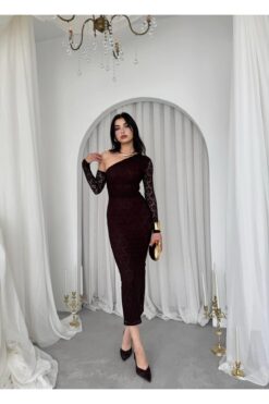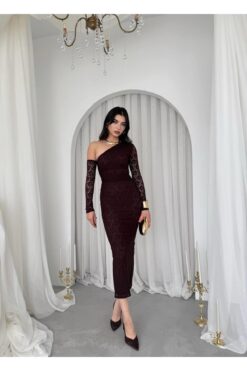 فستان أنيق مصمَّم من قماش الدانتيل الفاخر بلون بني ، يتميّز بقصّة ميدي ضيّقة تبرز جمال القوام. تصميم الكتف الواحد مع كم طويل من الدانتيل الشفاف يضيف لمسة أنثوية راقية تجمع بين البساطة والجاذبية. خيار مثالي للمناسبات الخاصة، السهرات أو حفلات الخطوبة، مع إمكانية تنسيقه مع كعب عالي وإكسسوارات لامعة لإطلالة متكاملة.