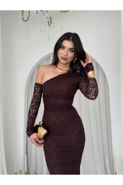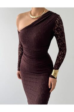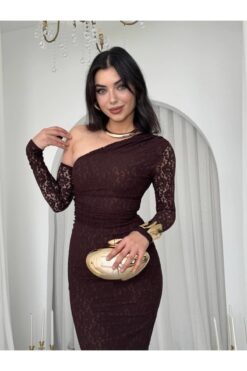 فستان دانتيل بني بكتف واحد