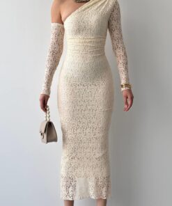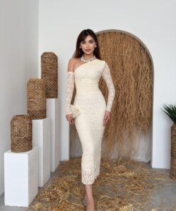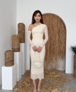 فستان أنيق مصمَّم من قماش الدانتيل الفاخر بلون بيج ، يتميّز بقصّة ميدي ضيّقة تبرز جمال القوام. تصميم الكتف الواحد مع كم طويل من الدانتيل الشفاف يضيف لمسة أنثوية راقية تجمع بين البساطة والجاذبية. خيار مثالي للمناسبات الخاصة، السهرات أو حفلات الخطوبة، مع إمكانية تنسيقه مع كعب عالي وإكسسوارات لامعة لإطلالة متكاملة.