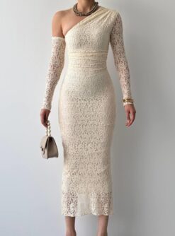فستان أنيق مصمَّم من قماش الدانتيل الفاخر بلون بيج ، يتميّز بقصّة ميدي ضيّقة تبرز جمال القوام. تصميم الكتف الواحد مع كم طويل من الدانتيل الشفاف يضيف لمسة أنثوية راقية تجمع بين البساطة والجاذبية. خيار مثالي للمناسبات الخاصة، السهرات أو حفلات الخطوبة، مع إمكانية تنسيقه مع كعب عالي وإكسسوارات لامعة لإطلالة متكاملة.