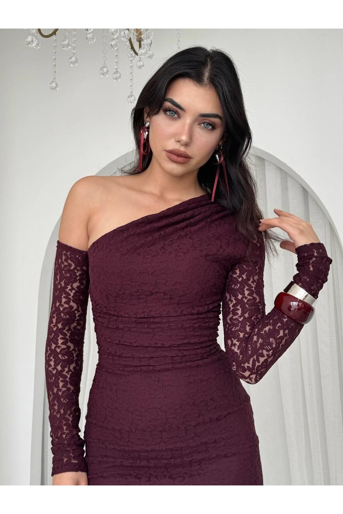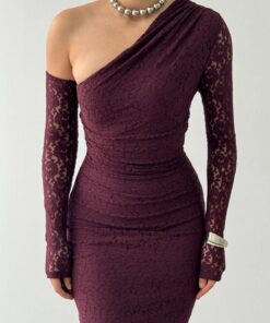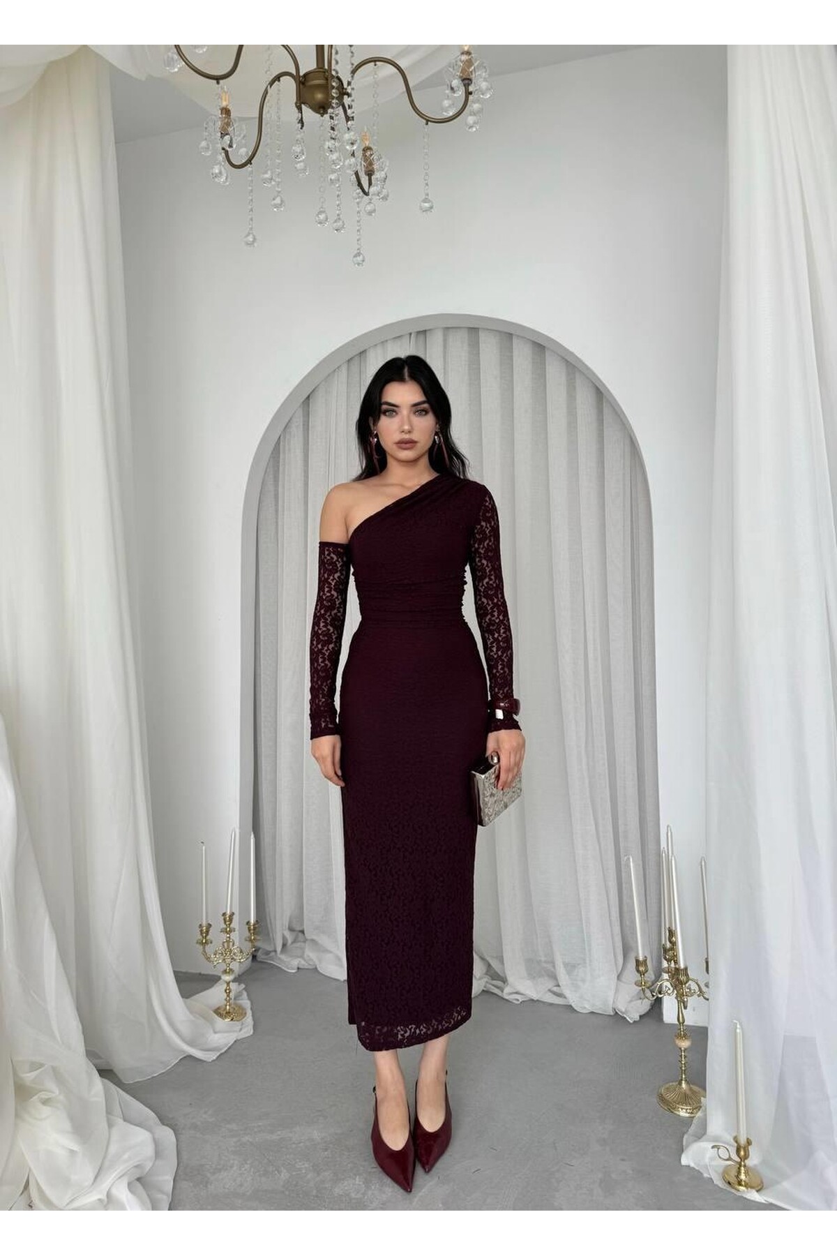 فستان أنيق مصمَّم من قماش الدانتيل الفاخر بلون عنابي ، يتميّز بقصّة ميدي ضيّقة تبرز جمال القوام. تصميم الكتف الواحد مع كم طويل من الدانتيل الشفاف يضيف لمسة أنثوية راقية تجمع بين البساطة والجاذبية. خيار مثالي للمناسبات الخاصة، السهرات أو حفلات الخطوبة، مع إمكانية تنسيقه مع كعب عالي وإكسسوارات لامعة لإطلالة متكاملة.