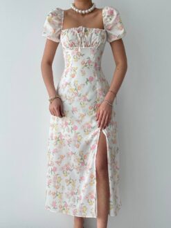 فستان ابيض بنمط زهور ملونة، بأكمام قصيرة منتفخة وتصميم جذاب عند الصدر. يتميز بشق جانبي طويل ويُصنع من قماش ناعم ومريح، مثالي للمناسبات الصيفية وحفلات الزفاف. متوفر بمقاسات S، M، L.