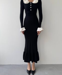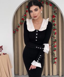فستان طويل ضيّق بتصميم أنيق وبسيط، يتميز بياقة بَيبي عريضة باللون الأبيض مع كشكش ناعم، وأزرار أمامية بارزة تضيف لمسة كلاسيكية. الأكمام مزوّدة بكشكش عند المعصم وزرار جانبية لتفصيل أنثوي، فيما تنتهي التنورة بكرانيش واسعة عند الحافة السفلية لتعطي إطلالة راقية ومميزة.