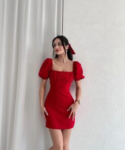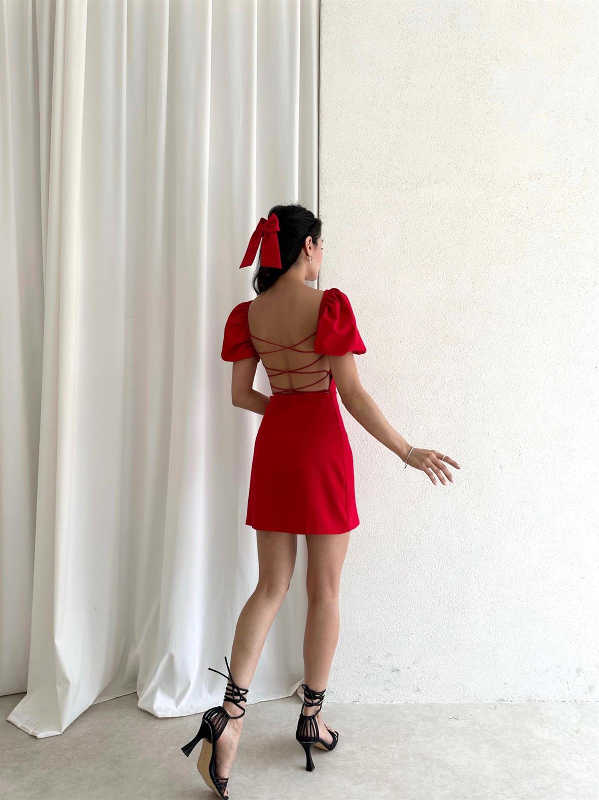 فستان قصير باللون الأحمر يتميز بتصميم أنيق. يحتوي الفستان على أكمام قصيرة منتفخة ورباطات متقاطعة على الظهر، مما يضفي لمسة جذابة وعصرية. القماش سلس ومريح، مما يجعله مثاليًا للمناسبات الخاصة أو السهرات.