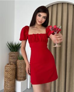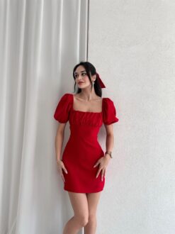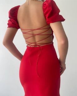فستان قصير باللون الأحمر يتميز بتصميم أنيق. يحتوي الفستان على أكمام قصيرة منتفخة ورباطات متقاطعة على الظهر، مما يضفي لمسة جذابة وعصرية. القماش سلس ومريح، مما يجعله مثاليًا للمناسبات الخاصة أو السهرات.