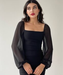 فستان كتفين بأكمام طويلة شفافة اسود