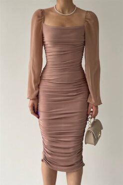 فستان أنيق بقصة ضيقة تبرز جمال القوام، يتميز بأكمام طويلة شفافة وتصميم يجمع بين البساطة والرقي، مما يجعله مناسبًا للمناسبات الخاصة.
