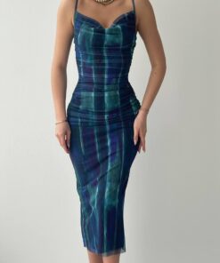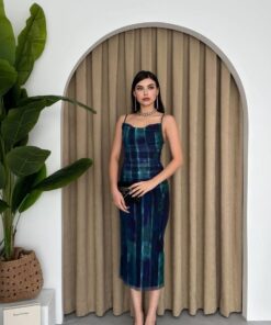 فستان أنيق بقصة ضيقة يبرز جمال القوام، مصنوع من قماش شيفون ناعم بنقشة خطوط فنية باللون الأزرق والبنفسجي والأخضر. يتميز بحمّالات رفيعة وياقة درابية تضيف لمسة أنثوية ناعمة. مثالي للسهرات والمناسبات الخاصة، ويمكن تنسيقه مع أكسسوارات ذهبية أو لؤلؤ لمظهر فاخر وجذاب.
