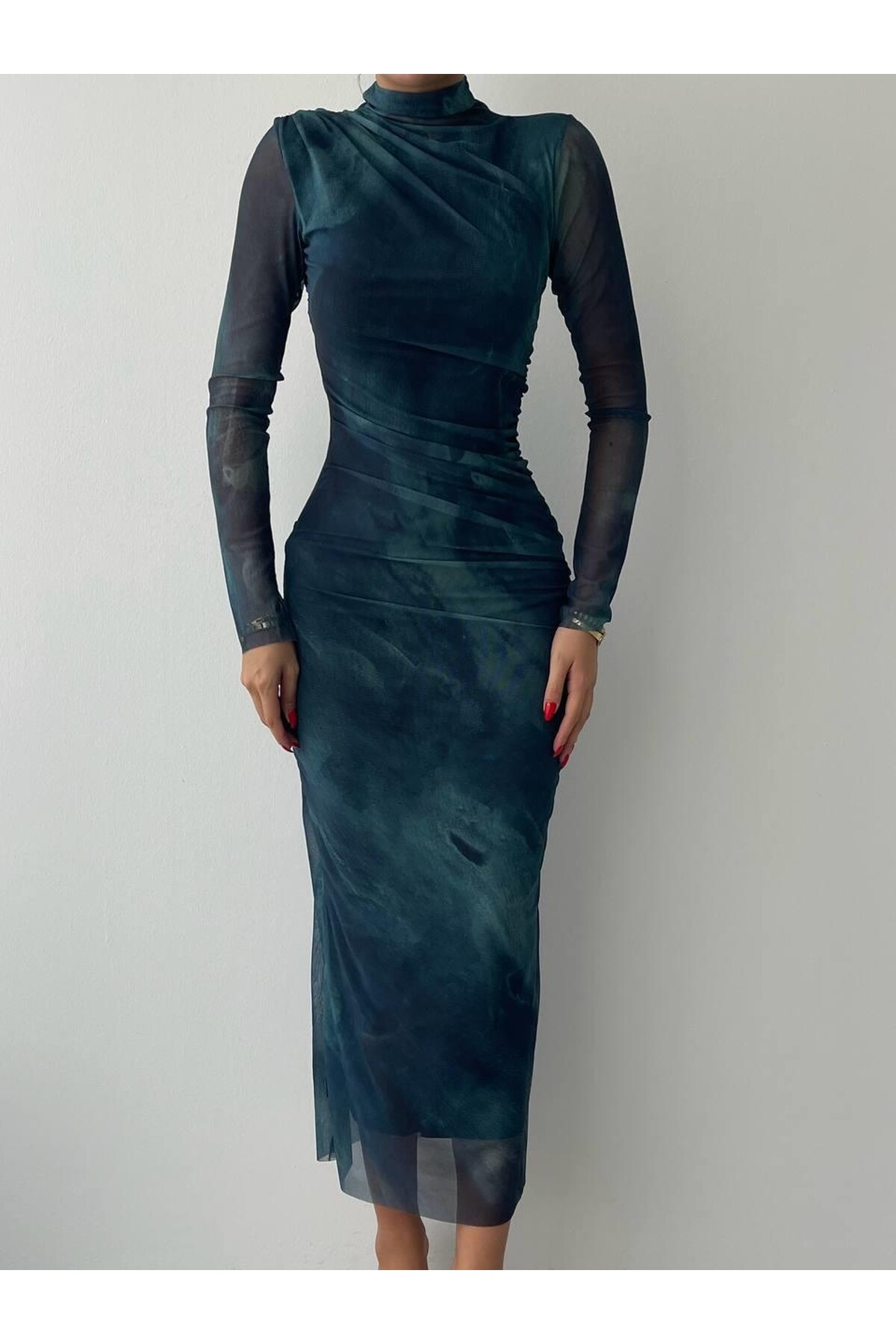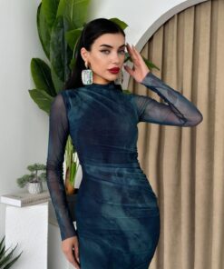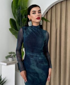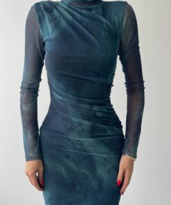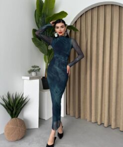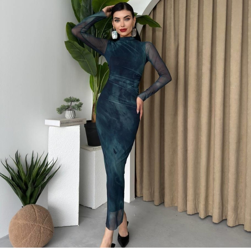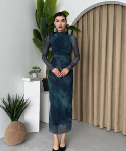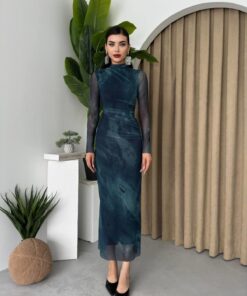 فستان ميدي ضيق بتصميم أنثوي عصري، مصنوع من قماش شفاف بطبقة مزدوجة تمنح قواماً ممشوقاً ومظهراً راقياً. يتميز بأكمام طويلة شفافة وياقة عالية أنيقة، مع قصّة مائلة خفيفة تضيف لمسة فنية وجاذبية خاصة. مثالي للسهرات والمناسبات التي تحتاج لإطلالة لافتة ومميزة.