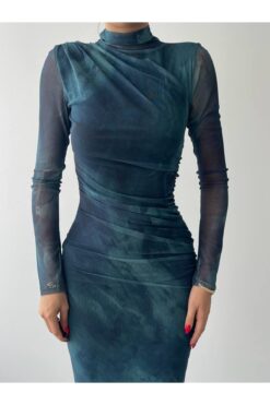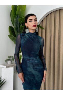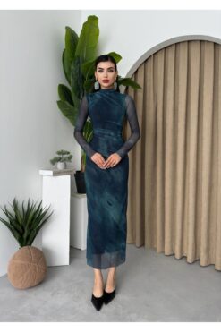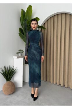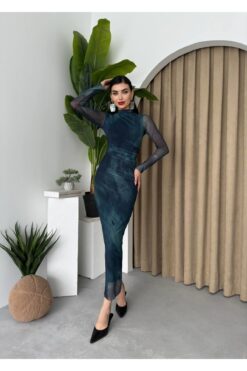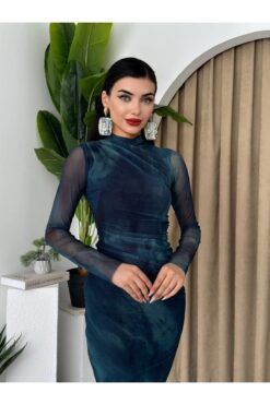 فستان ميدي ضيق بتصميم أنثوي عصري، مصنوع من قماش شفاف بطبقة مزدوجة تمنح قواماً ممشوقاً ومظهراً راقياً. يتميز بأكمام طويلة شفافة وياقة عالية أنيقة، مع قصّة مائلة خفيفة تضيف لمسة فنية وجاذبية خاصة. مثالي للسهرات والمناسبات التي تحتاج لإطلالة لافتة ومميزة.