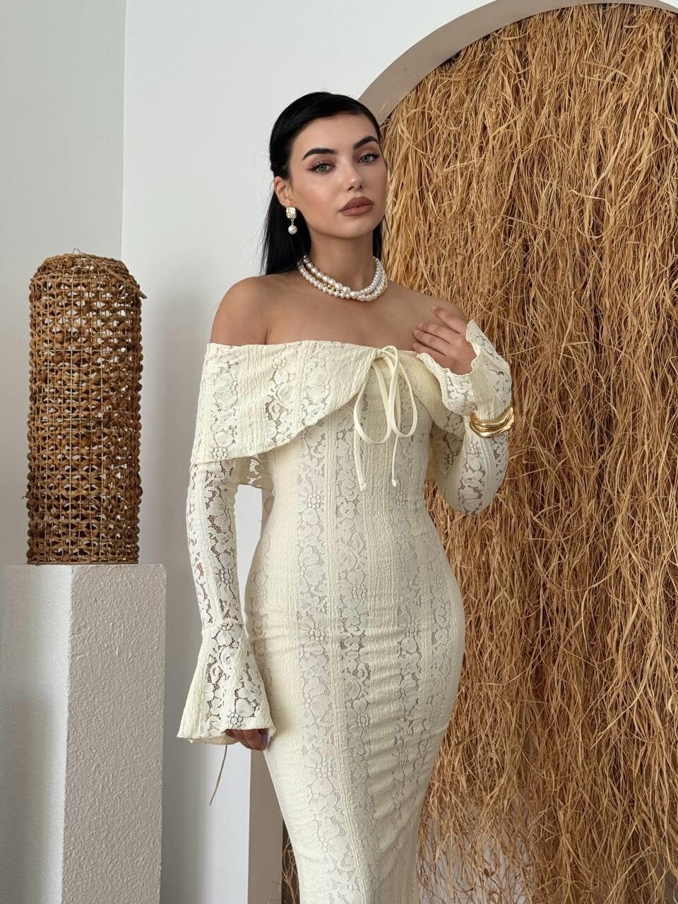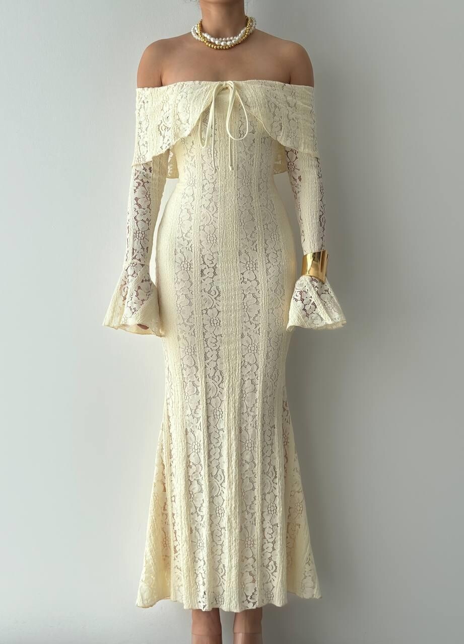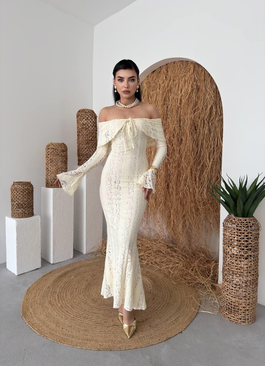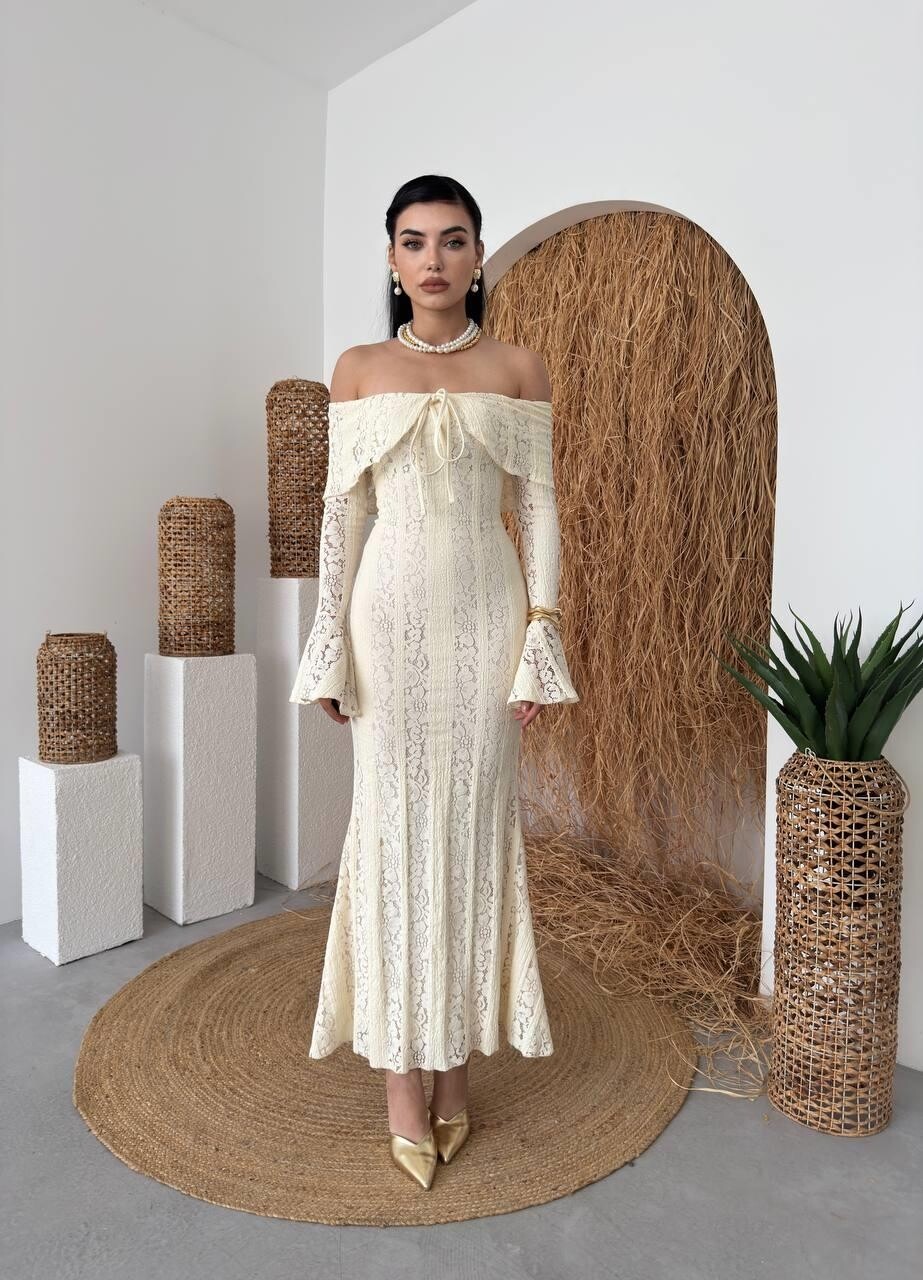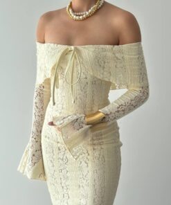 مصنوع من قماش دانتيل فاخر يمنح الإطلالة ملمساً ناعماً وتفاصيل فريدة تبرز الذوق الرفيع. تصميمه سترابلس (بدون أكتاف) يعكس جاذبية راقية، مع ربطة أمامية تضيف لمسة أنثوية ناعمة.