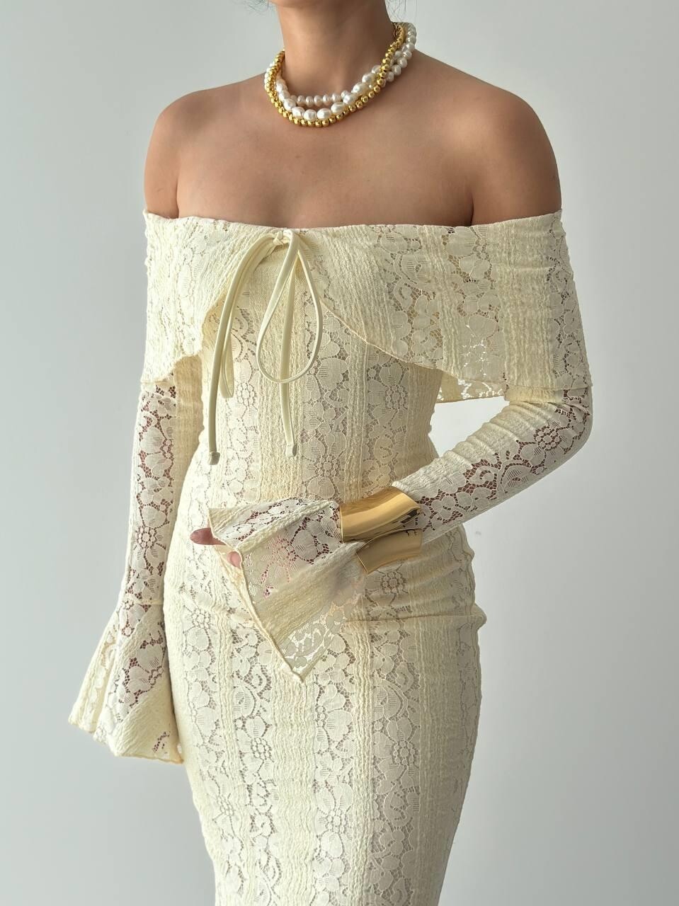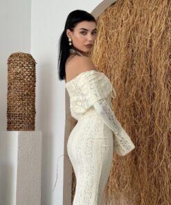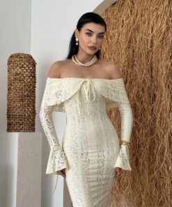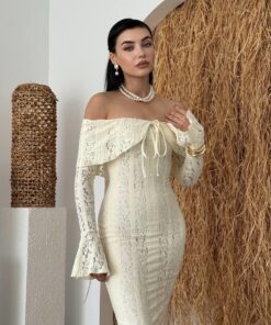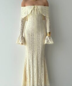 أما الأكمام الطويلة بتفصيل الجرس فهي لمسة فخمة تضيف سحرًا كلاسيكيًا لتصميم عصري.