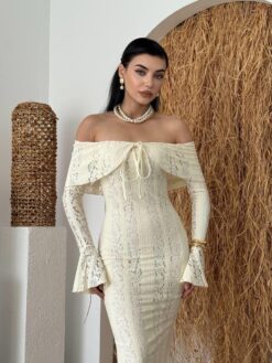 أما الأكمام الطويلة بتفصيل الجرس فهي لمسة فخمة تضيف سحرًا كلاسيكيًا لتصميم عصري.