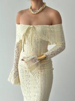 مصنوع من قماش دانتيل فاخر يمنح الإطلالة ملمساً ناعماً وتفاصيل فريدة تبرز الذوق الرفيع. تصميمه سترابلس (بدون أكتاف) يعكس جاذبية راقية، مع ربطة أمامية تضيف لمسة أنثوية ناعمة.