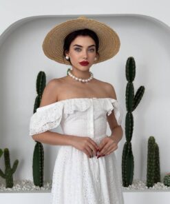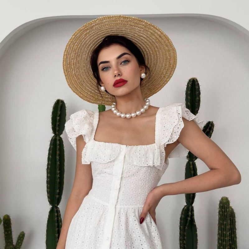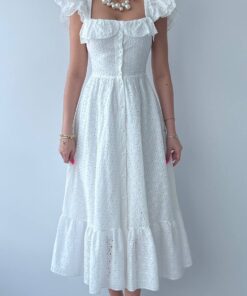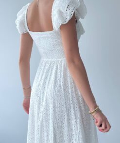 الفستان في الصورة هو فستان ميدي أبيض مصنوع من قماش مخرم بنمط عيون صغيرة. يتميز الفستان بتفاصيل أنثوية مثل الأكمام الكشكشية الواسعة والياقة المربعة. يمتد الزر الأمامي لأسفل الجزء الأوسط من الفستان، مما يضيف لمسة تقليدية وأنيقة. يحتوي الفستان أيضًا على خصر محدد ليبرز القوام، ويتوسع التنورة بشكل لطيف ليصل إلى أسفل الركبتين.