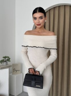 فستان أنيق مصمم بقصة الكتف المكشوفة (off-shoulder) مع أطراف مموجة تضيف لمسة أنثوية ناعمة. الفستان مصنوع من خامة التريكو المرنة، مما يوفر الراحة والتناسب المثالي مع الجسم. يتميز بلونه البيج الكلاسيكي، مما يجعله خيارًا مثاليًا للمناسبات الأنيقة والإطلالات اليومية الراقية.