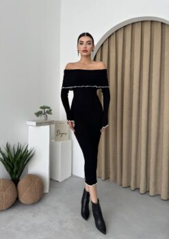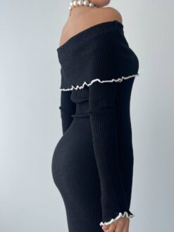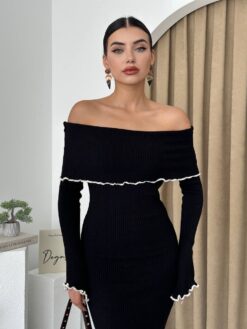 فستان أنيق مصمم بقصة الكتف المكشوفة (off-shoulder) مع أطراف مموجة تضيف لمسة أنثوية ناعمة. الفستان مصنوع من خامة التريكو المرنة، مما يوفر الراحة والتناسب المثالي مع الجسم. يتميز بلونه الأسود الكلاسيكي، مما يجعله خيارًا مثاليًا للمناسبات الأنيقة والإطلالات اليومية الراقية.