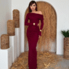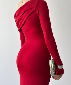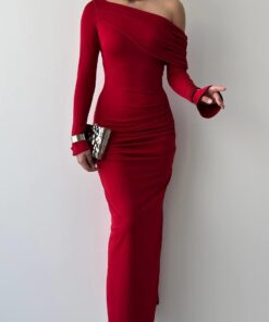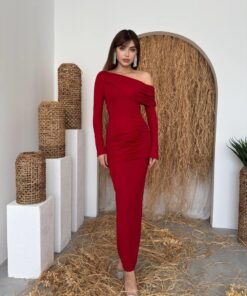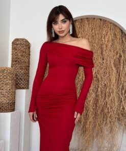 الفستان يظهر بلون أحمر أنيق مع قصة طويلة ضيقة (Bodycon) تبرز قوام الجسم، وقماش مطاطي مشدود مع كشكش جانبي. يتميز بكتف ساقط (One-Shoulder/Off-Shoulder) أقرب للـ Straplez مما يعطيه لمسة عصرية أنثوية.